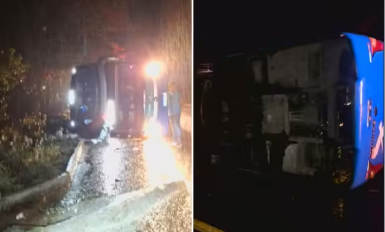 Segundo o Corpo de Bombeiros, um ônibus tombou após desviar de uma árvore caída na rodovia.