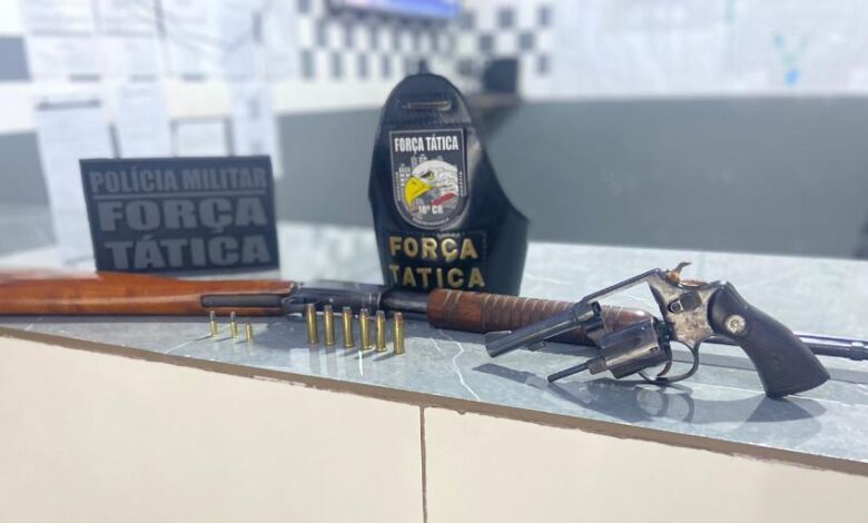 Os policiais também fizeram buscas no interior da residência do homem e encontraram duas armas de fogo, sendo um revólver de calibre .38 e um rifle de calibre 22 acompanhados de munições para os respectivos armamentos. O suspeito afirmou ser o proprietário dos objetos mas não apresentou documentação de porte.