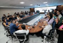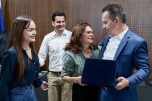 Governador Mauro Mendes sancionou projeto que cria premiação, e a secretária de Comunicação, Laice Souza, divulgou as regras em cerimônia no Palácio Paiaguás.