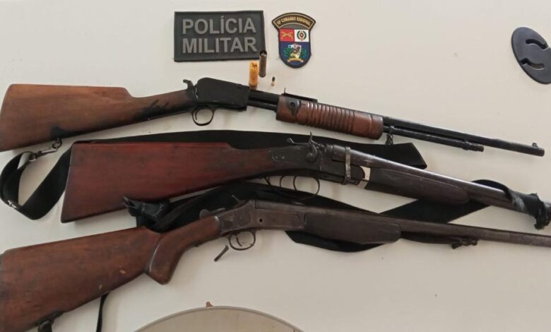 Ainda na abordagem, o homem foi questionado sobre a existência de armas de fogo na casa, levando os policiais até um cômodo onde foram encontrados um rifle, uma carabina e uma espingarda, todas sem documentação legal.